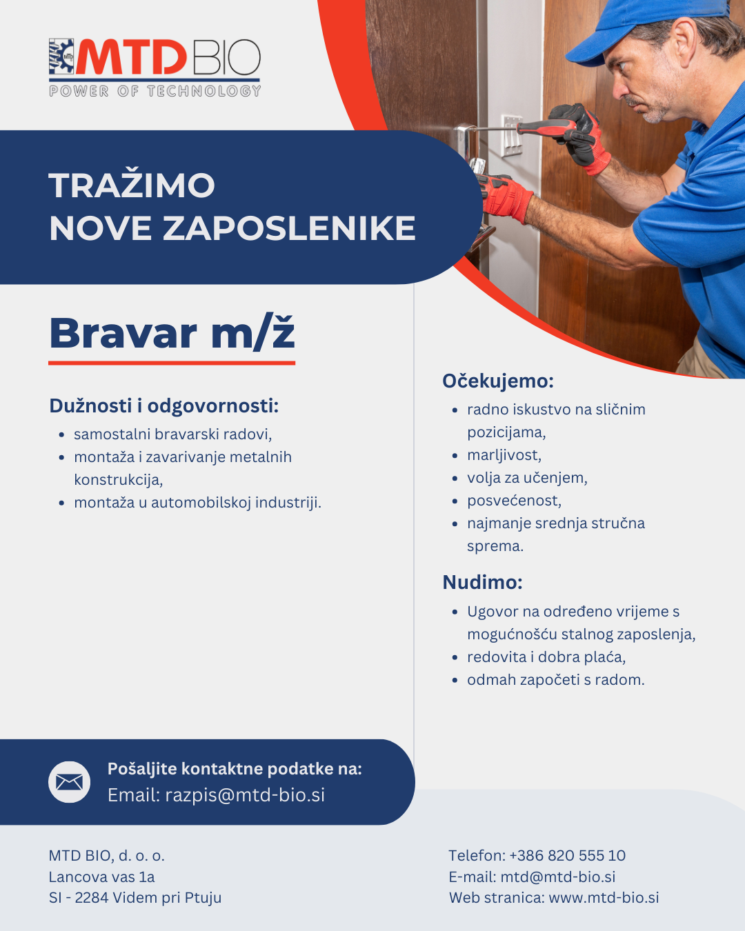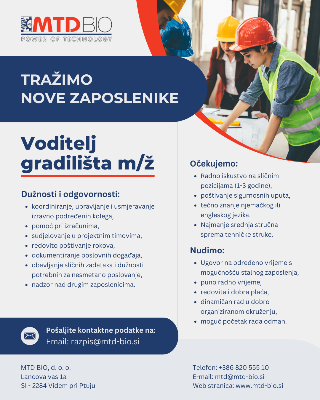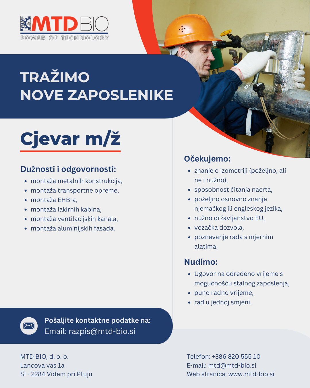 Ako tražite dugoročnu suradnju i prepoznali ste pravu priliku te želite svojim iskustvom doprinijeti još učinkovitijem radu tvrtke koja se temelji na dobrim odnosima, kvaliteti i ulaganju u nove tehnologije, pozivamo vas da nam pošaljete svoje kontakt podatke na e-mail adresu navedenu u nastavku.